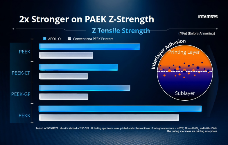 sikrer lave indre spenninger og god mellomlagsbinding av deler. Samtidig med nye profilene kan man skrive ut store deler i PEEK svært enkelt.