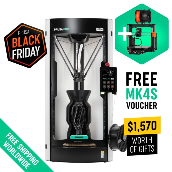 Prusa Pro HT90 er en deltakinematisk 3D-printer med et sylindrisk utskriftsområde (Ø300 × 400 mm). Den er spesielt designet for å maksimere potensialet til avanserte materialer som ABS, ASA, PCCF og PA. Det oppvarmede kammeret, som når opptil 90 °C, og det innovative kjølesystemet, gir enestående lagvedheft og utskriftskvalitet.