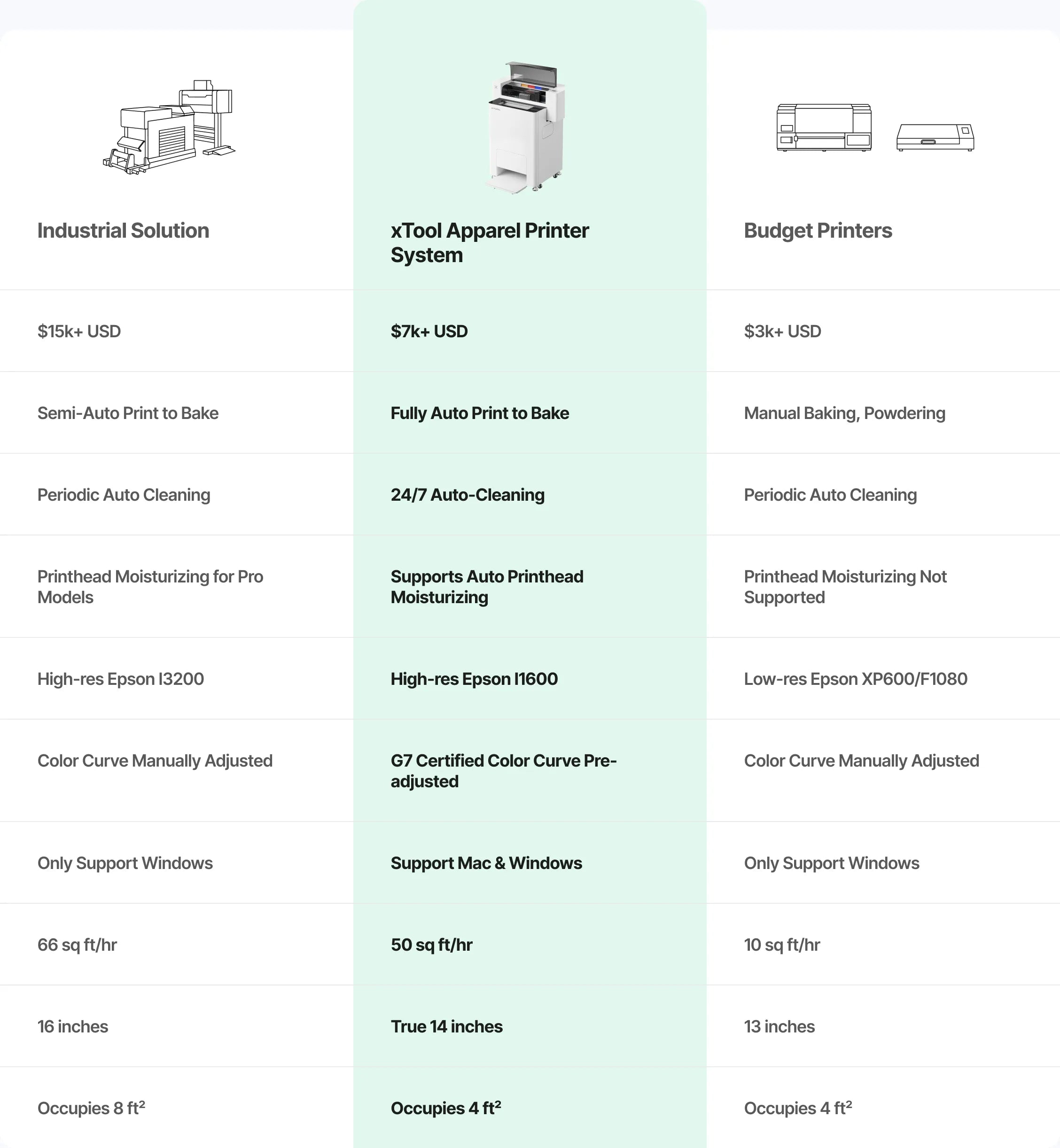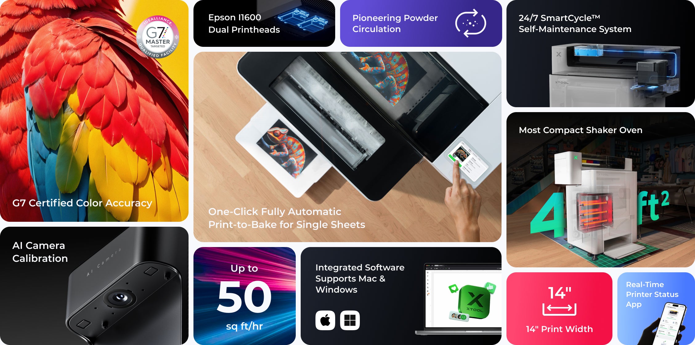 xTool Apparel Printer samler alle de viktigste trinnene i DTF-utskrift. Den trykker designet ditt på film, påfører pulveret, rister av overflødig pulver og herder filmen i løpet av minutter. Tradisjonelle DTF-oppsett krever ofte flere separate enheter og mye manuell inngripen, men denne maskinen integrerer alt i en smidig og helhetlig prosess.